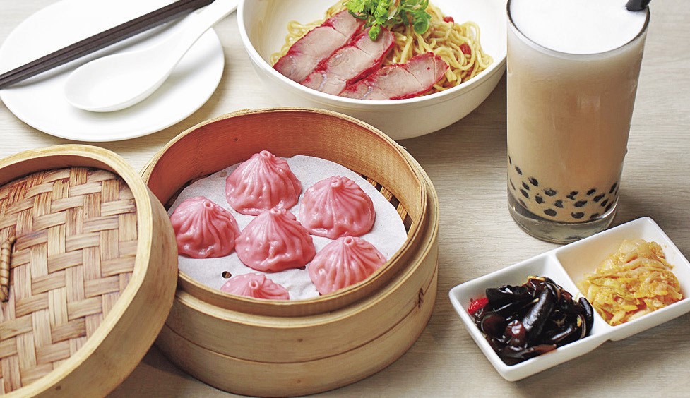 MRTで10分移動して中山駅に着いたら、「金品茶語」へ。個性あふれるカラフルな見た目の小籠包は、味わいもさまざまで見るのも食べるのも楽しいです♪ピンクの小籠包は「桜花蝦小籠包(NT$140)」で、中には桜エビがたっぷり!小籠包以外にも、チャーシューがトッピングされたまぜ麺「紅糟猪肉黒糖麻油麺(NT$125)」などもおすすめです!