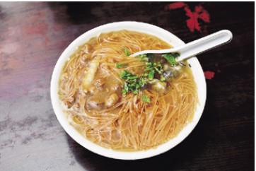 士林阿亮麺線の麺線(小:NT$30、 大:NT$50)は、とろみのあるカツオだしスープにカキ、豚肉、モツが入ったそうめん。名物グルメだらけの市場の中でも特に人気の一品です。