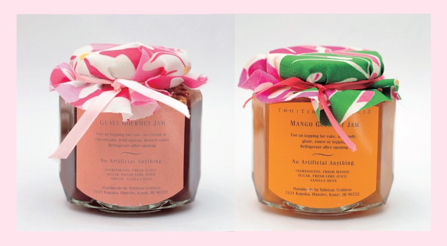 南国ならではのフレーバーが揃うジャムにはハワイアンキルト調の布カバーが付いており、特別なおみやげにぴったりです!左はグアバジャム($10)、右はマンゴージャム($15)。