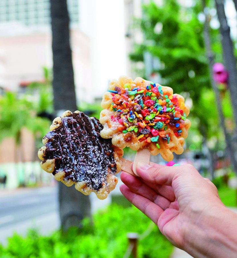 モチポップ(各$3.50)は、弾力ある食感のワッフルにチョコなどをトッピング。持ち手があるので食べ歩きに◎