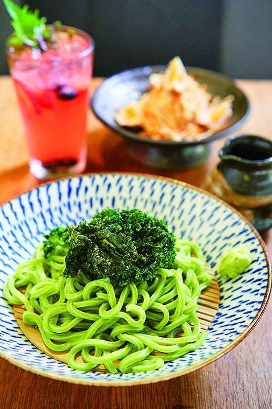 店内の製麺室で作られるケールを使ったうどん、「ローカルケールうどん」($12)。