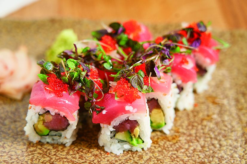 近海アヒポケの巻き寿司新鮮なマグロを外巻きに!食感も楽しめるお寿司です($17)。