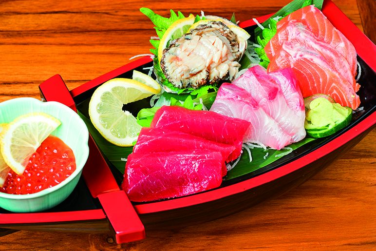 活きのいい魚介を使った料理が楽しめる「居酒屋 海」の刺身盛り合わせは、5種$42.95。