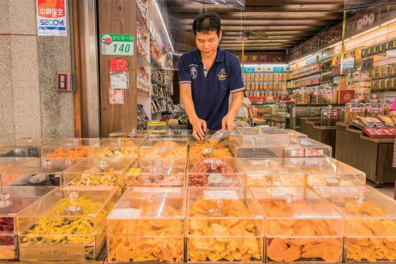 「元信蔘藥行」は、質のいい乾物が買えると現地マダムの間で評判のお店。ドライフルーツやナッツの品ぞろえが豊富です。特に人気なのは台湾産アップルマンゴー。