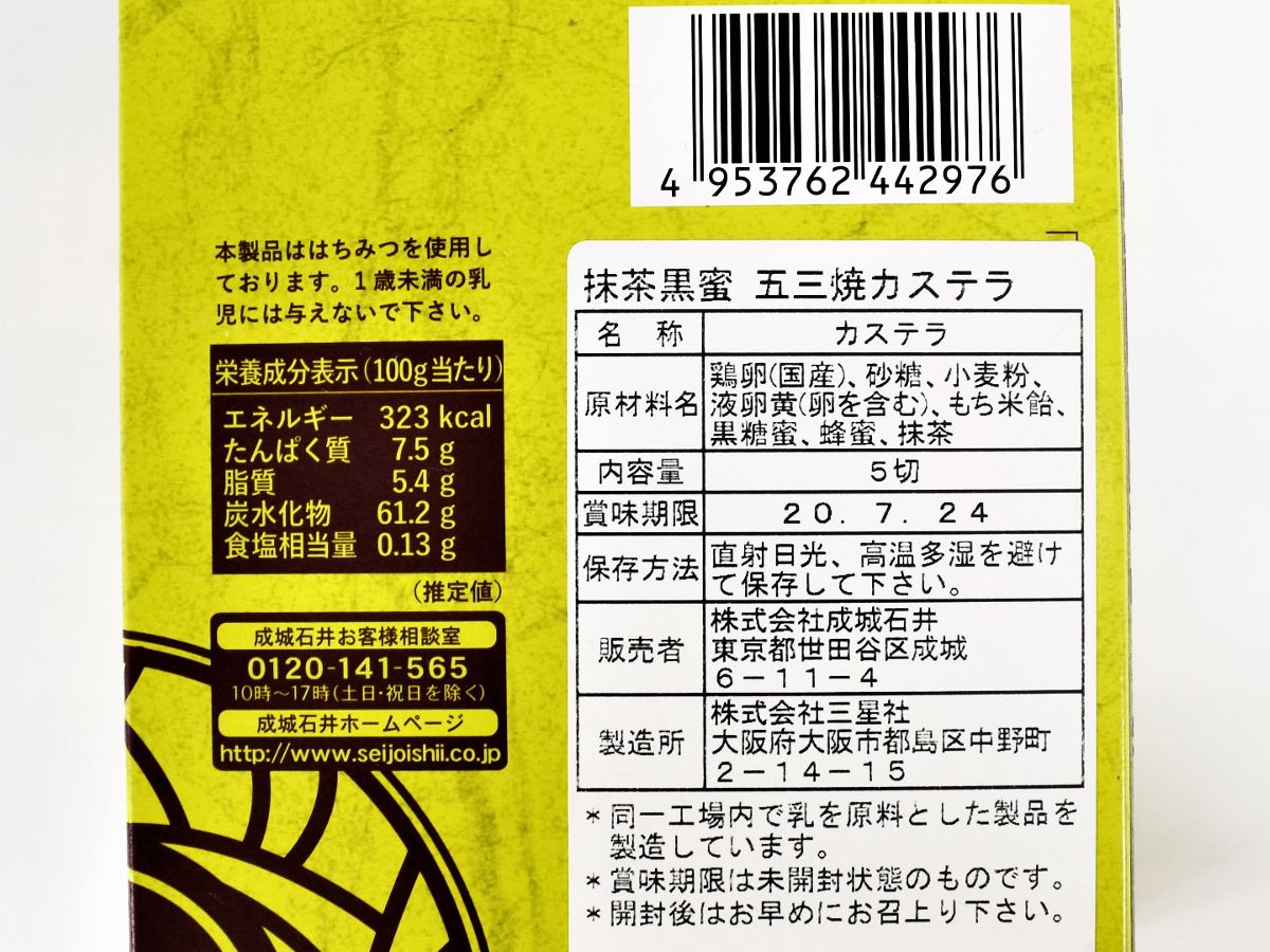 「抹茶黒蜜五三焼カステラ 5切」(成城石井)