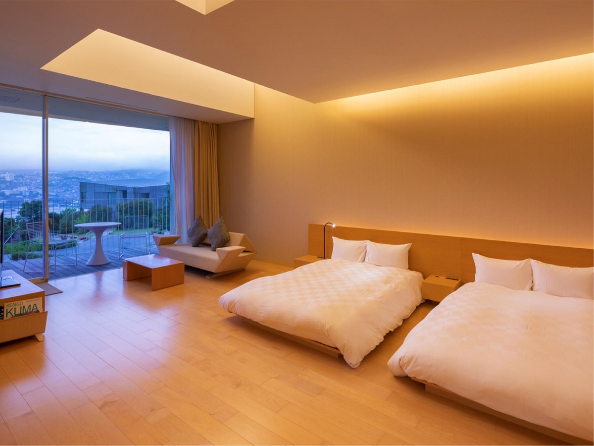 JR長崎駅から車で10分、稲佐山の中腹に位置し、世界新三大夜景を望む全室オーシャンビューが魅力のリゾートホテル。設計は日本を代表する建築家、隈研吾氏。ホテルの敷地に足を踏み入れるだけで、まるで別世界にきたかのような贅沢な空間にうっとりとしてしまいます。