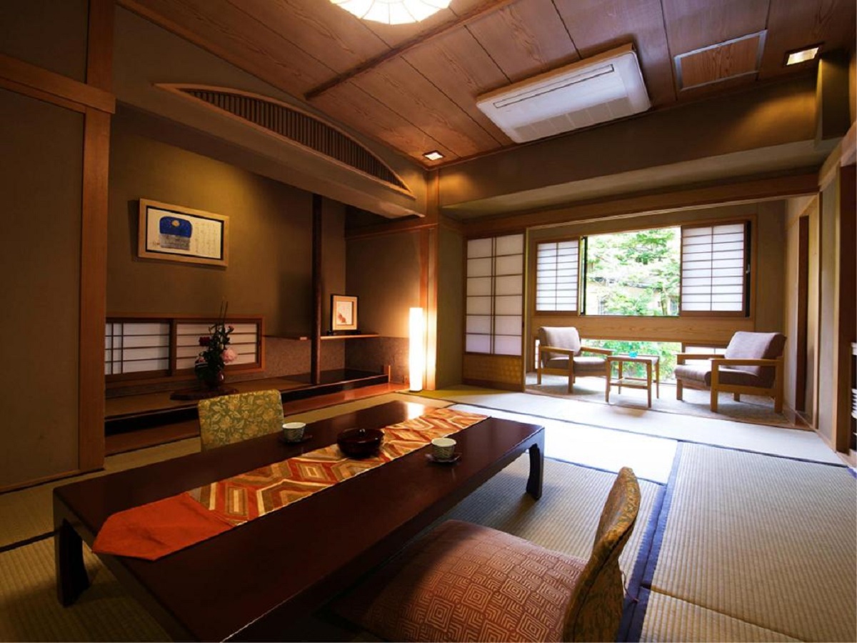 落ち着いた佇まいの館内は、全館畳敷き。靴を脱いで、ゆったりできるのは嬉しいですね。渓流沿いに建つ旅館だけあって、多くの客室で川のせせらぎや涼やかな風が感じられ、四季折々の風景が望めます。露天風呂付き客室も平日ひとり2万円台から設定があり(※2020年6月末現在)、ちょっと贅沢して、プライベートな露天風呂を楽しむ夢も現実に近づきますね。