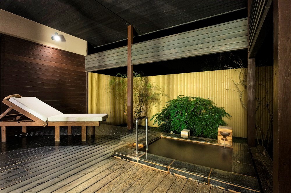 こちらの宿の魅力は、客室の温泉にも。1棟ごとに100%源泉かけ流しの露天風呂と内湯のふたつの湯があり、心ゆくまで温泉を楽しむことができます。泉質はこのあたりではめずらしい炭酸水素塩泉の自家源泉。地下1200mからくみ上げたお湯は、美人湯や美肌の湯といわれていて、お肌もしっとりつやつやに。疲労回復、関節痛、冷え性などさまざまな疾患にも効能があるといわれています。