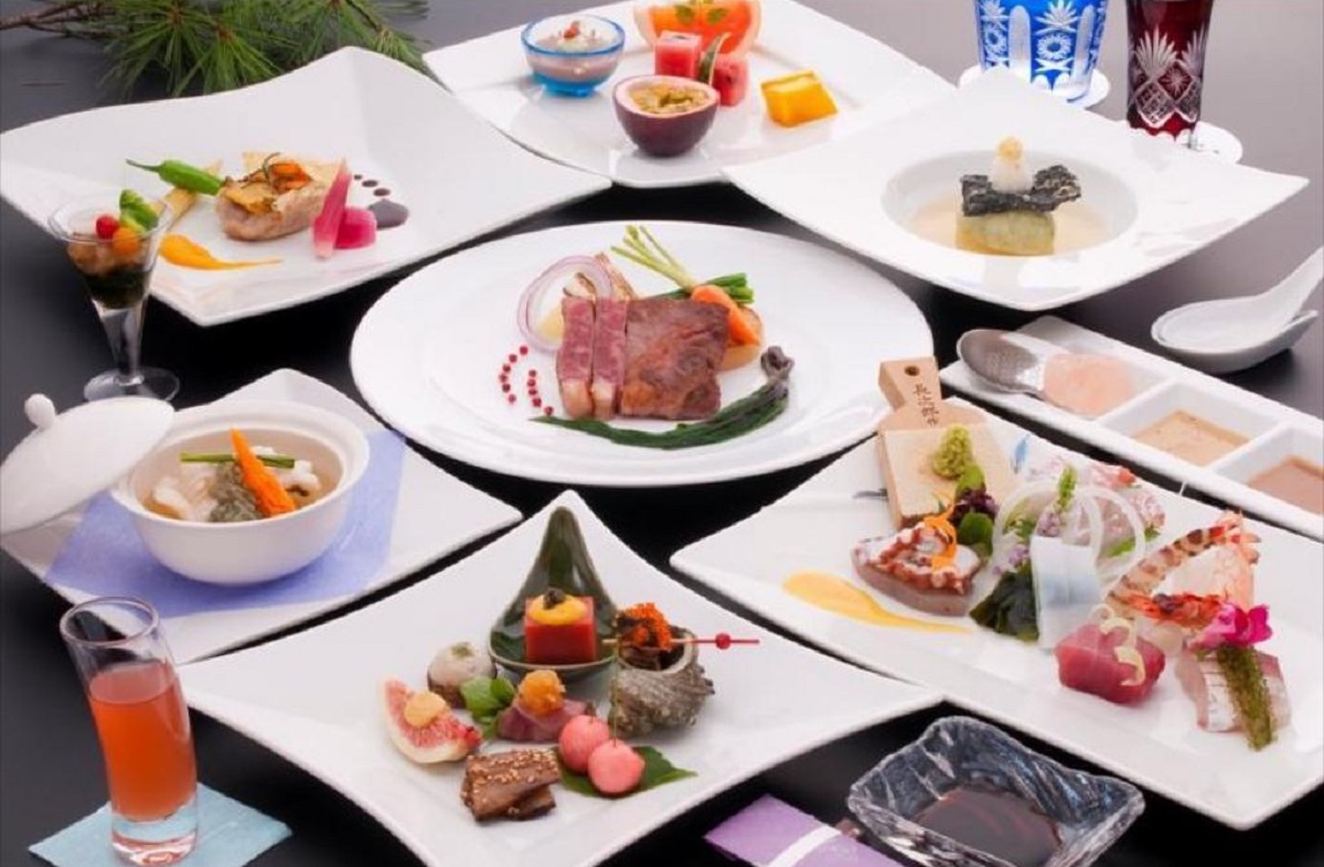 料理は、一皿一皿に趣向を凝らした和洋折衷の創作料理。女性の満足度を意識したコースづくりで、地元の新鮮素材を使って彩り豊かで繊細な盛り付けなど、目でも舌でも楽しめるものばかり。個室の食事会場や、落ち着いた雰囲気のレストラン内ではグループごとに衝立てが用意され、ゆったりとした空間で食事をいただけます。気のあう友達や母娘で訪れたい、癒される旅館です。