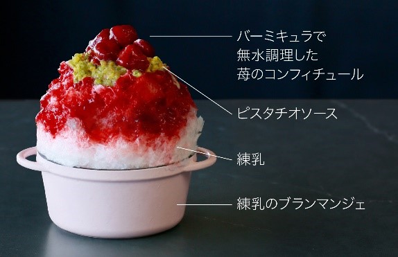 「バーミキュラ氷鍋 苺・ピスタチオ・練乳」1300円は、苺のコンフィチュール、相性の良いピスタチオの氷鍋。一番下には、練乳のブランマンジェ入り。