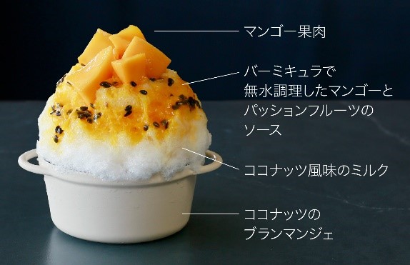 「バーミキュラ氷鍋 マンゴー・パッションフルーツ・ココナッツ」1300円は、マンゴーとパッションフルーツのソースとココナッツの風味を効かせたミルク、上にはマンゴーの果肉がたっぷり。一番下には、フレーバーとぴったりなココナッツのブランマンジェが入っています。