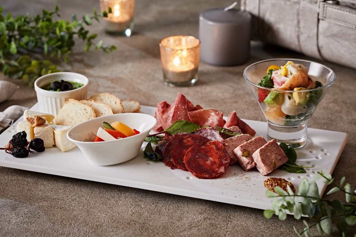 魚介のセビーチェ、季節野菜のピクルス、サーモンタルタル、そら豆のフムス カマンベールチーズ、自家製パテとシャルキュトリー盛り合わせ