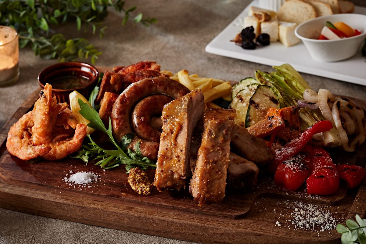 大山鳥のグリル、麹味噌でマリネしたポークスペアリブの B.B.Q、サルシッチャのグリル、季節野菜のグリル、フレンチフライ、ソフトシェルシュリンプのフリット