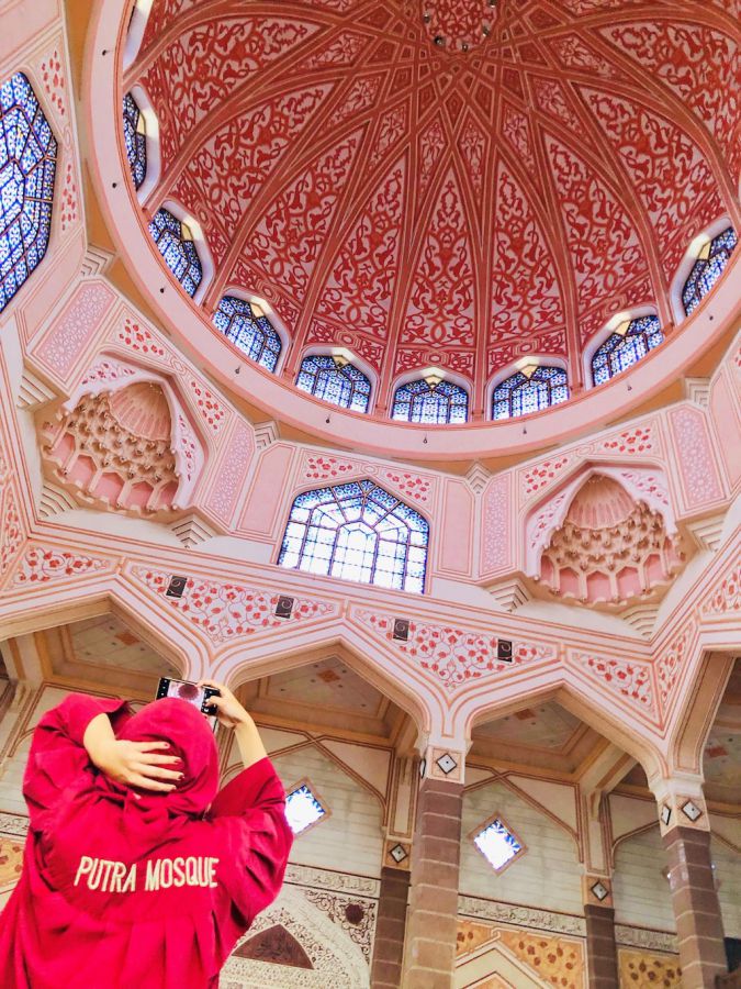 新都市プトラジャヤの湖畔に浮かぶモスクは街の象徴としても有名。湖越しからの姿も素敵です!モスクの神秘的な雰囲気や建築の美しさを感じながら、ピンクの空間を堪能しましょう。