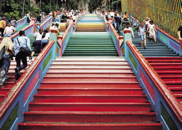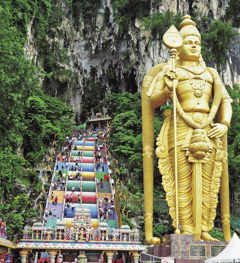 1891年に立てられた、巨大な石灰岩の鍾乳洞に作られたヒンドゥー寺院は、見た目のインパクトもスケールも特大!そびえ立つ黄金の軍神「ムルガン神」は高さ42.7mもあり、その奥の虹色の階段との組み合わせは、日本では見られない異国感を味わわせてくれます。少し離れた場所から手前の軍神とカラフルな階段を一緒に写真に収めましょう!