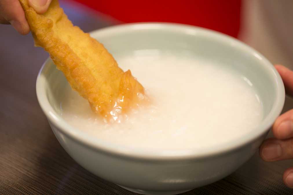 ヤウチャッカイは、適当な大きさにちぎり、こうしてお粥にディップしていただくのがおすすめ。ちなみに、謝甜記ではこのヤウチャッカイもお店で手作りしています。