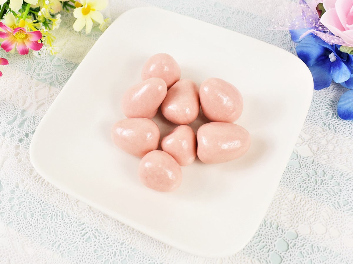 フリーズドライのいちごをまるごとチョコレートで包み込んだ“ストロベリーチョコがけいちご”。粒の大きさが不揃いないちごが使われているため、時には思いもよらないビッグサイズに出会えることも…。