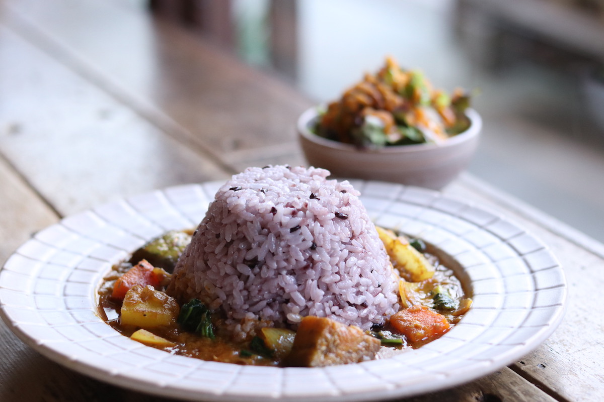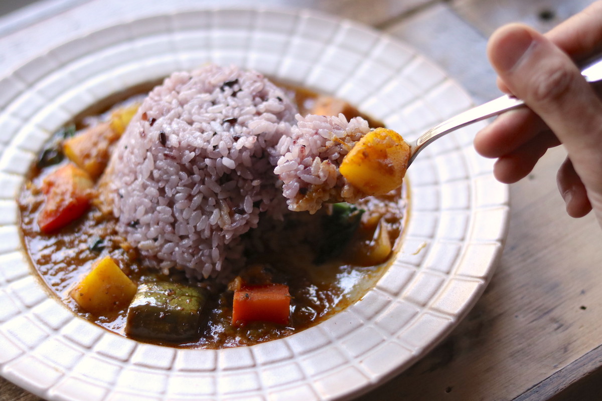 今回チョイスした野菜カレーは、ピリリと辛く旬の野菜がたっぷり入った滋味深いカレー。スパイス効果なのか、ひと皿食べても、胃はすっきりです。