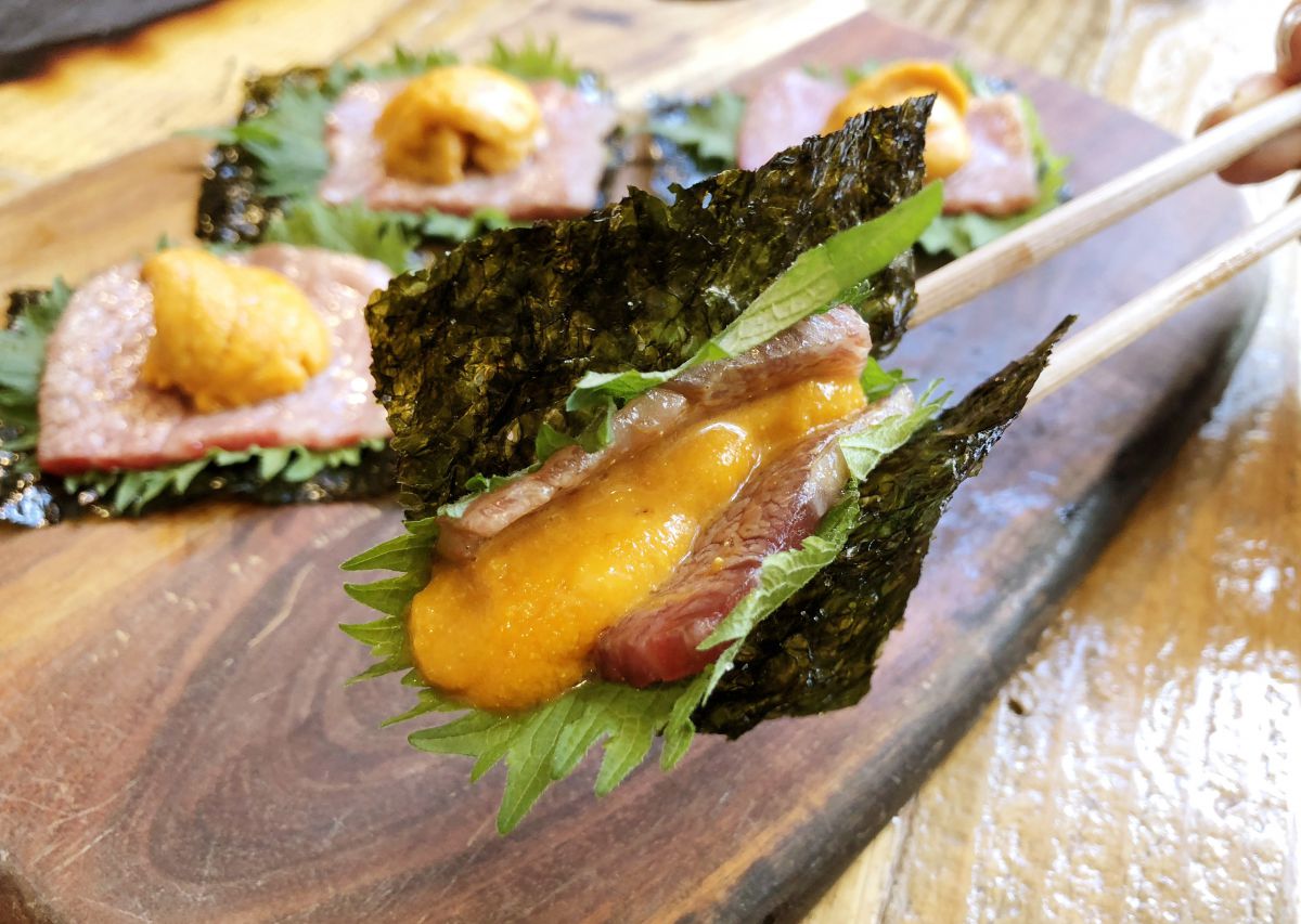 さらに、オーナーがNYで修行を積んだお店からレシピを持ち帰ったという名物料理「肉ウニ」をいただきます。韓国のり、シソの上に最高級の霜降り肉と、とろっとろのウニがのっていて、見ているだけでも幸せな気分に♡