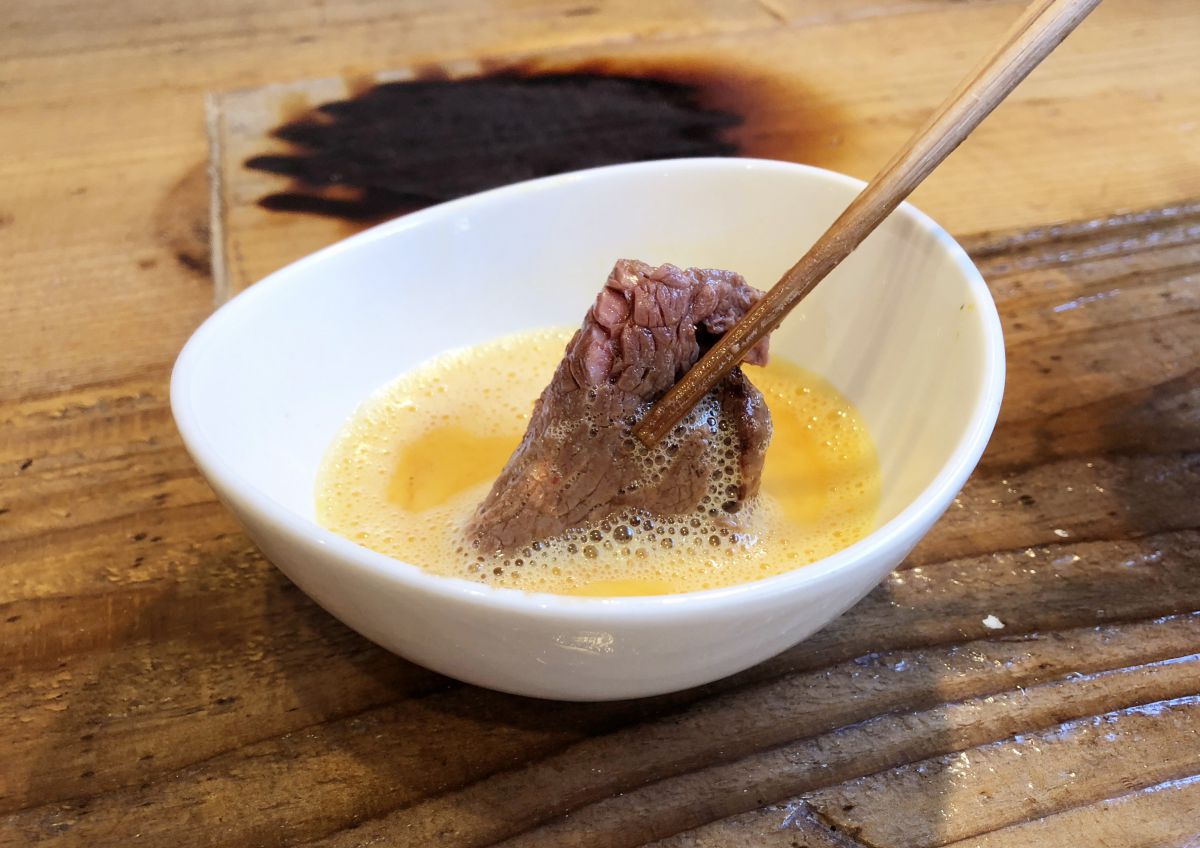 お肉はオリジナルのフルーツベースのタレにつけてから、さらに卵につけて食べるのもおすすめ!「幸せのタマゴ」という二黄卵の卵なので、量もたっぷりです。