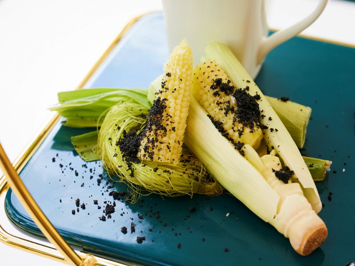 食べてみてびっくり!土に見立てた香ばしいパウダーとみずみずしいヤングコーンがベストマッチ。パウダーとともに軽く塩が振られているので、ヤングコーンの甘さも一層引き立ちます。