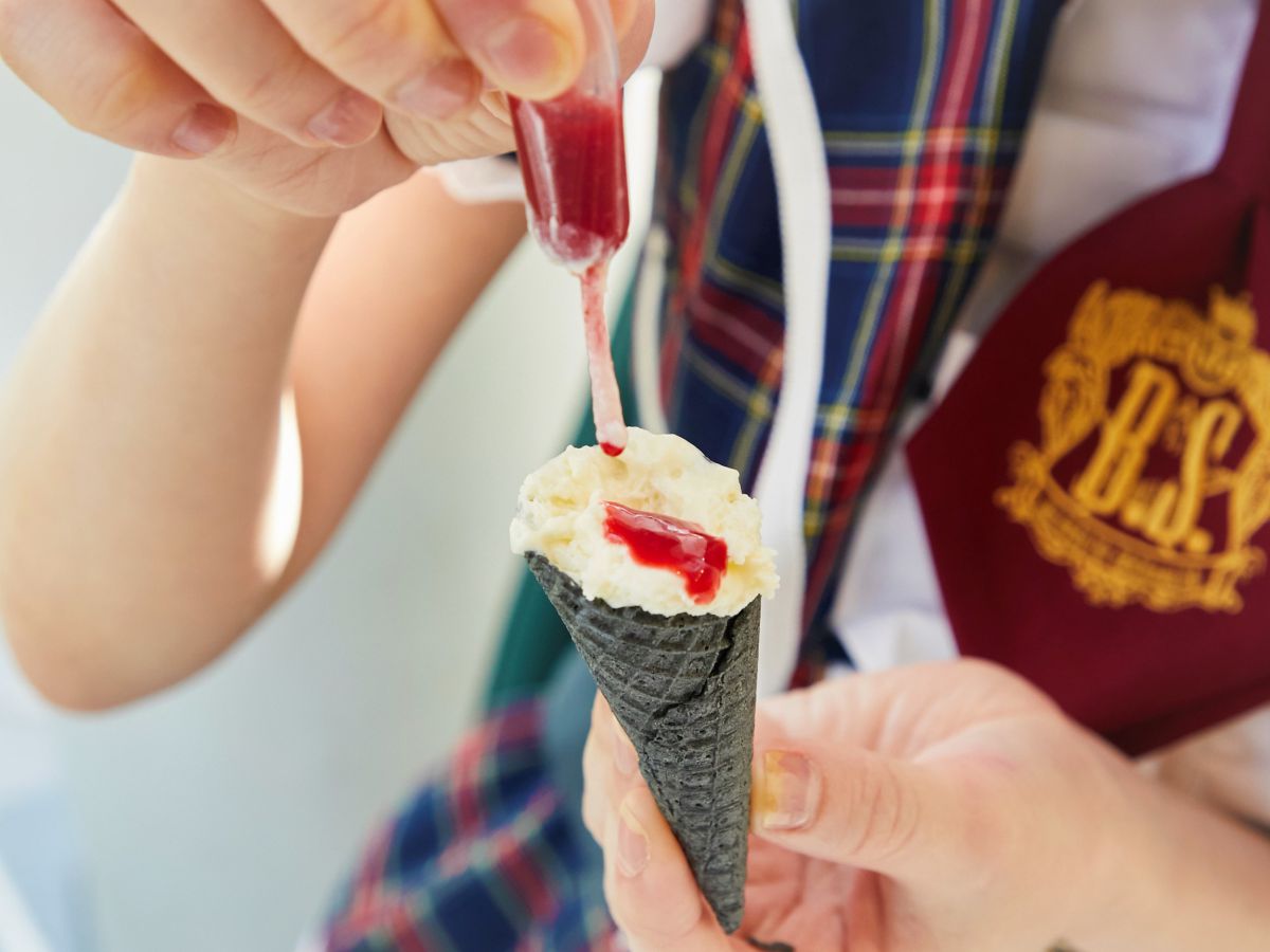 スポイトの中身は甘酸っぱいベリーソース!それをふわふわのクリームチーズムースにたっぷり絞っていただきます♪ ポイントは、コーンの底までスポイトをぐっと押し込んでソースを行きわたらせること!