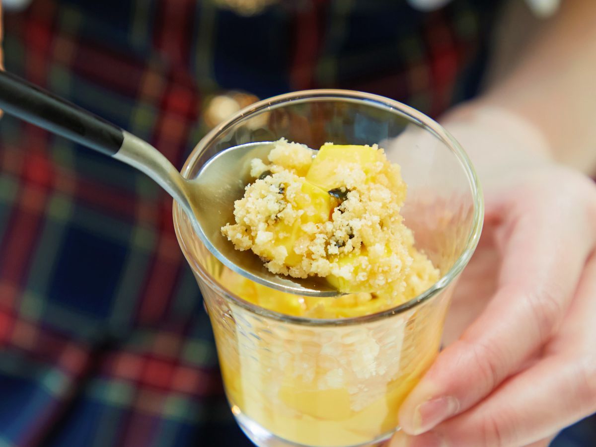 とろとろ&濃厚なマンゴープリンとパッションフルーツのプチプチ感、そしてサクサクとしたクランブル(そぼろ状のクッキー生地)が口の中で絶妙なハーモニーを奏でてる~♪ これはやみつきになるおいしさです!