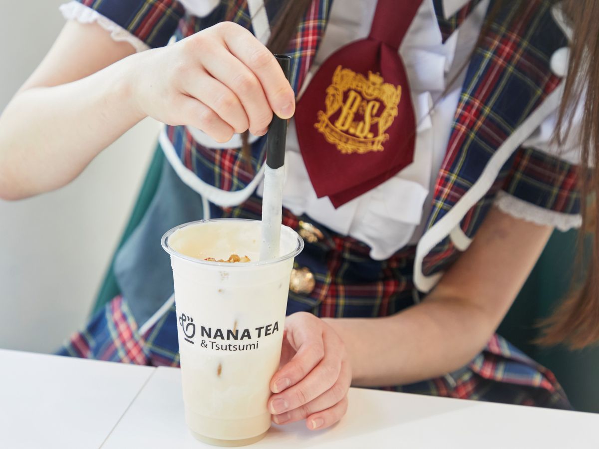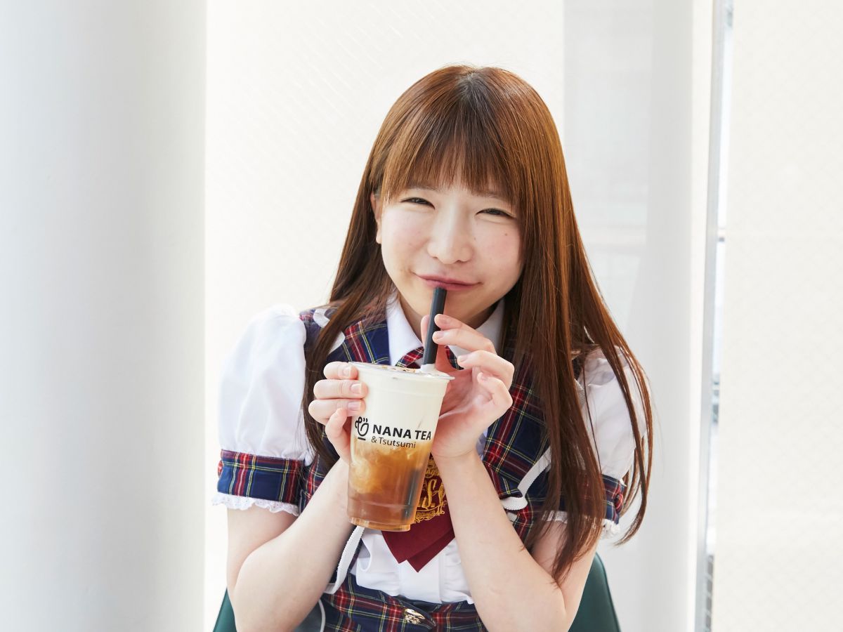 私が飲んでいるのは「NANAチーズティー」。ベースになっている中国茶は「岩茶(がんちゃ)」と呼ばれるもので、岩壁や山の峰などの岩場で育つ茶葉を使ったお茶なんだそう。その中でも高級茶とされている「岩茶 大紅袍(だいこうほう)」を使ったこだわりの一品なんですよ!