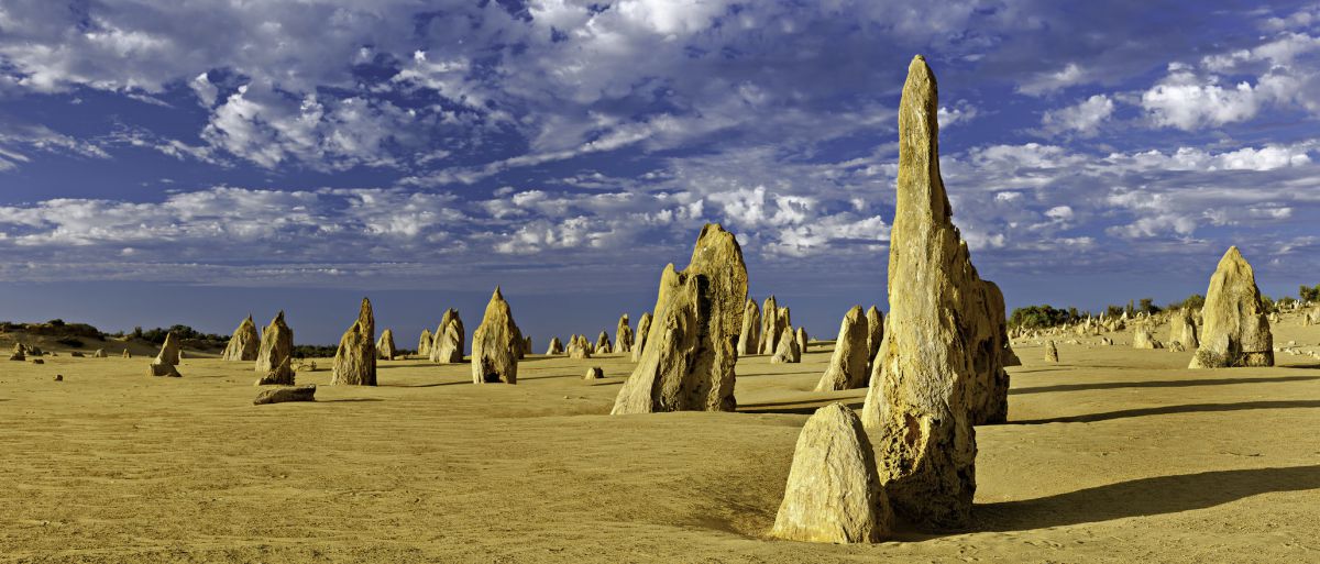 パースから北へ約250kmに位置するナンバン国立公園は、ピナクルズの奇岩群で有名です。荒涼とした金色の砂漠に、何千もの石柱が林立する、まるで異世界のような不思議な光景が広がります…!