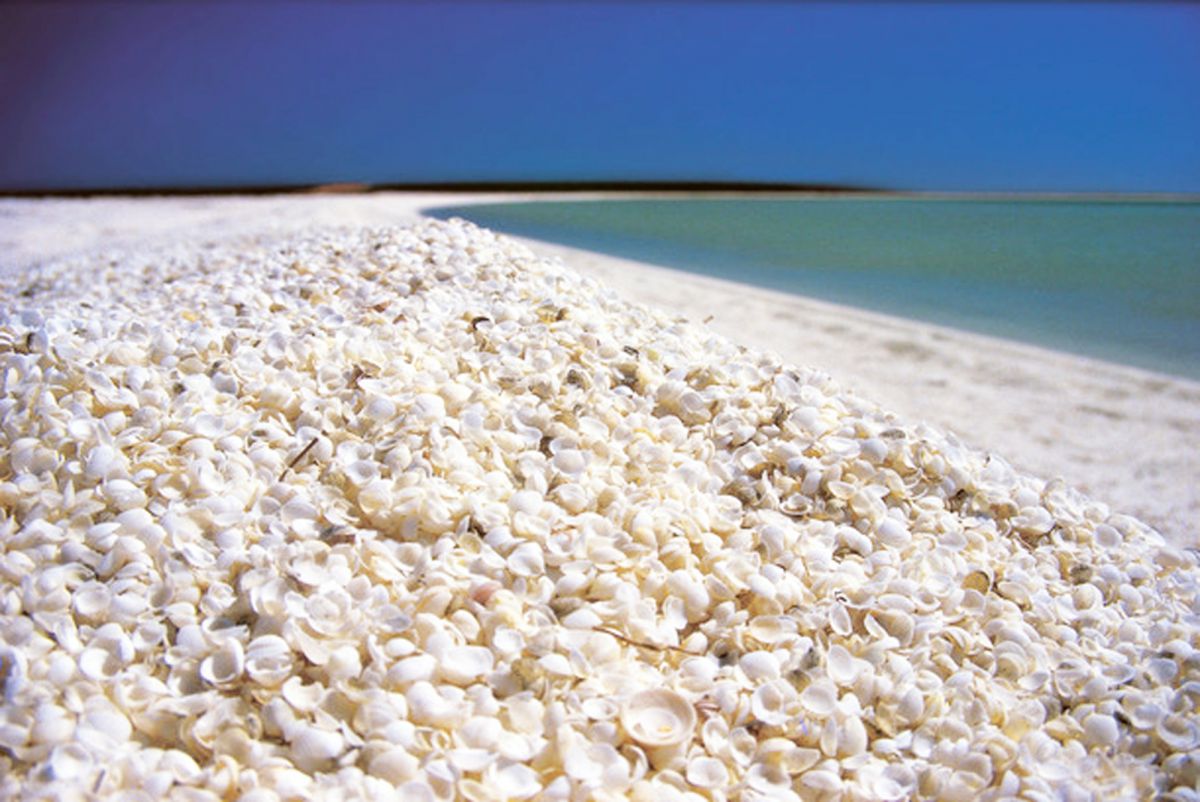 4000年前から小さな白い貝殻が蓄積してできた「シェルビーチ」は、白い浜と真っ青な海が、鮮やかなコントラストを描き出します。長さ約110km、深さは約10mにも及びます。