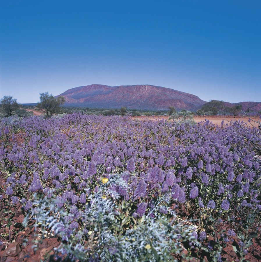 マウントオーガスタスの北側にあるエミューヒル・ルックアウトからは全景を眺めることができ、夕暮れ時に刻々と色を変える岩肌は必見!7月初旬からは、周辺に巨大な猫ジャラシのようなピンクのマラマラが一面に咲き、赤い大地を華やかに彩ります♪