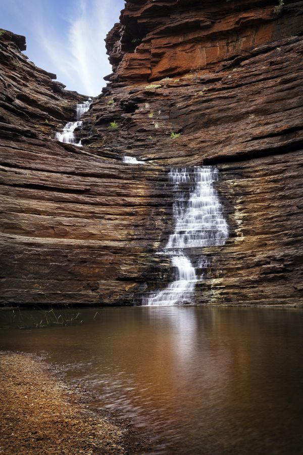 パースから北東へ約1400km、広大なアウトバックに位置するカリジニ国立公園。地殻変動や侵食など25億年にわたる地球の営みが造り上げた急峻な峡谷や断崖など、圧巻の景色が広がります。崖上に位置するオクサー展望台からは、大地にぱっくりと口を開けた岩肌と、深い谷底の雄大な光景が迫ってきます。渓谷には水遊びもできる滝や天然のプールがあり、公園内で唯一、年間を通して水が流れるデイルズ渓谷のフォーテスキュー滝では、滝つぼに自然の淡水プールがあります。