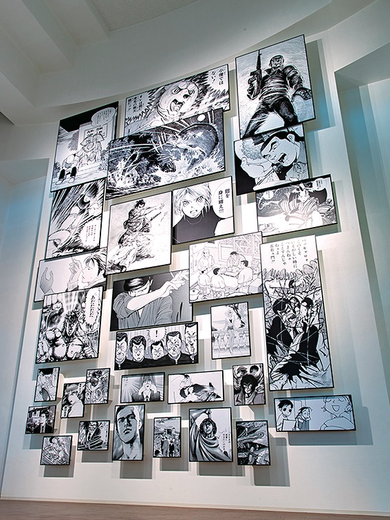 入口で来館者を出迎えてくれるのは、そうそうたる作家の名作で彩られた巨大なマンガウォールです。見上げれば、壁一面を埋め尽くす名シーンの数々が。
