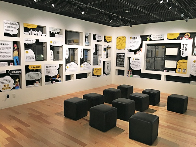 マンガ制作の過程や美術館の取り組みを通して、マンガ文化を紹介しています。キャラクターパネルや収蔵する実際の原画を使って、原画とその保存の意義を伝えています。