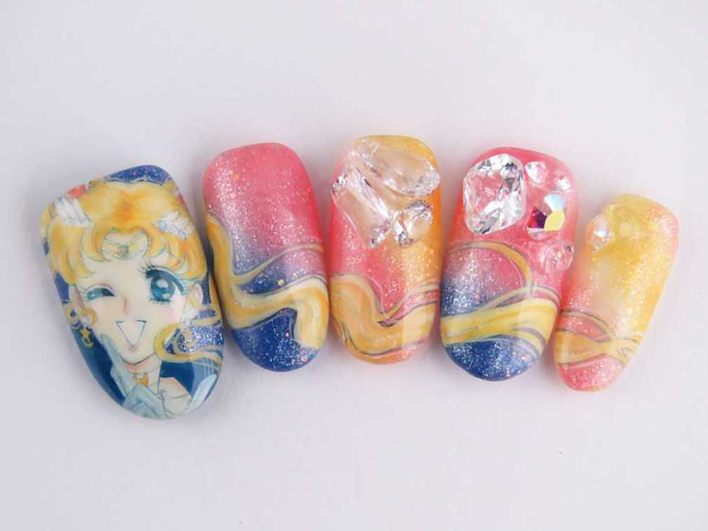 こちらの『美少女戦士セーラームーン』のネイルは、キラキラ輝くグラデーションカラーに、クリスタルをイメージした大粒のストーンで、幼いころに憧れたセーラームーンの世界観を再現しています。