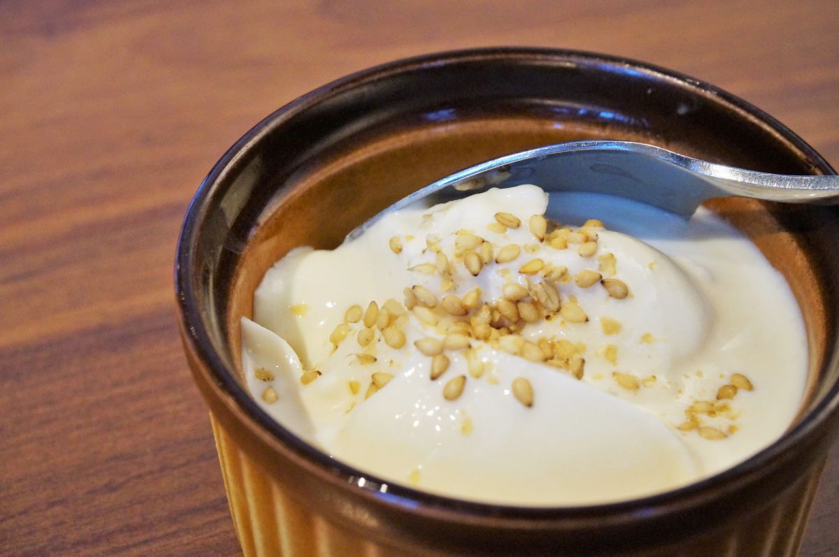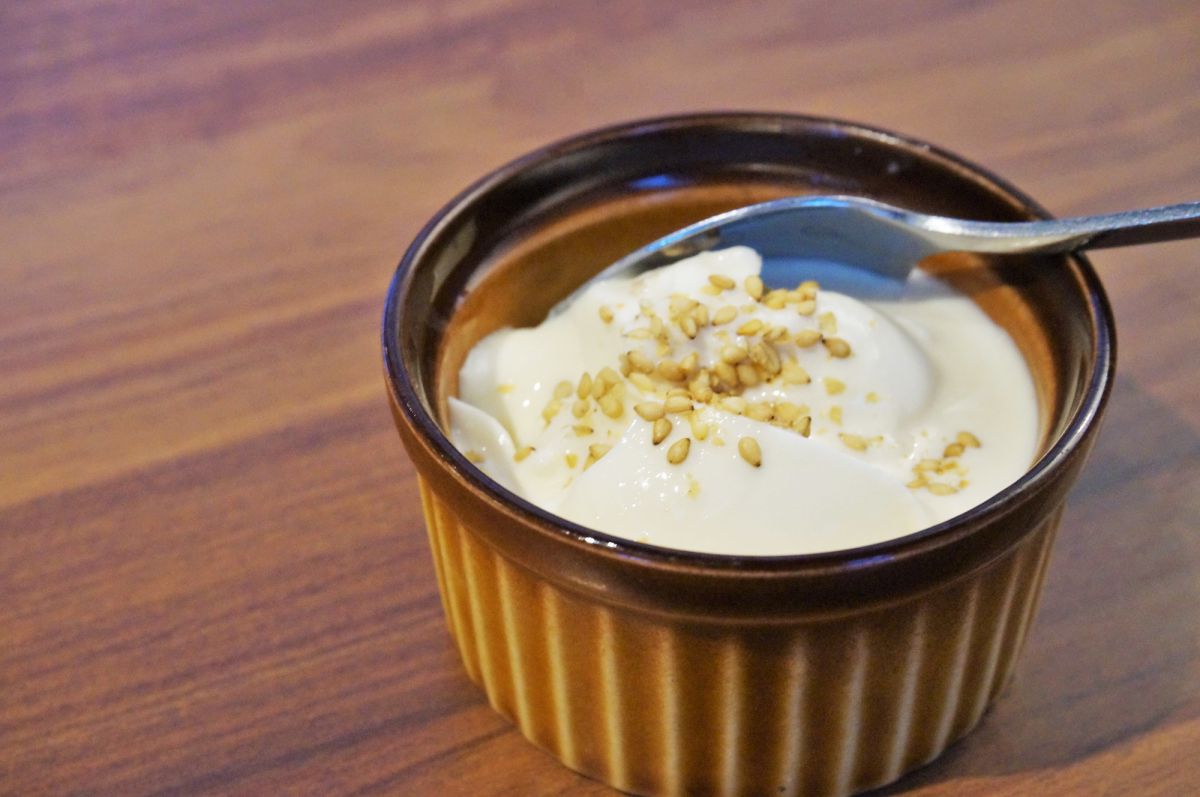 辛さのあとにはやさしい味わいの「白ごまの濃厚杏仁豆腐」380円(税別)で締めましょう。