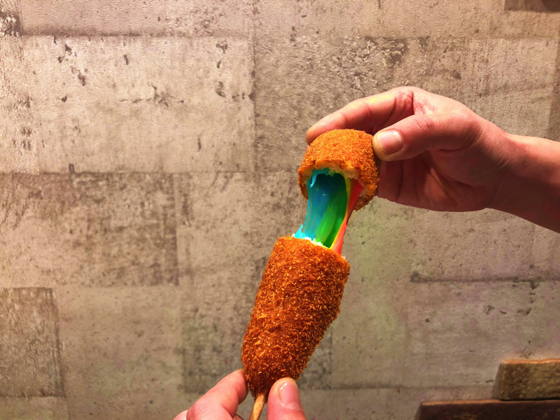 ハットグの激戦区である新大久保でひときわ存在感を放っている「春川(チュンチョン)チーズタッカルビ」。 こちらのお店では、なんと7色のモッツァレラチーズが入った「レインボーハットグ」(400円)がいただけます。