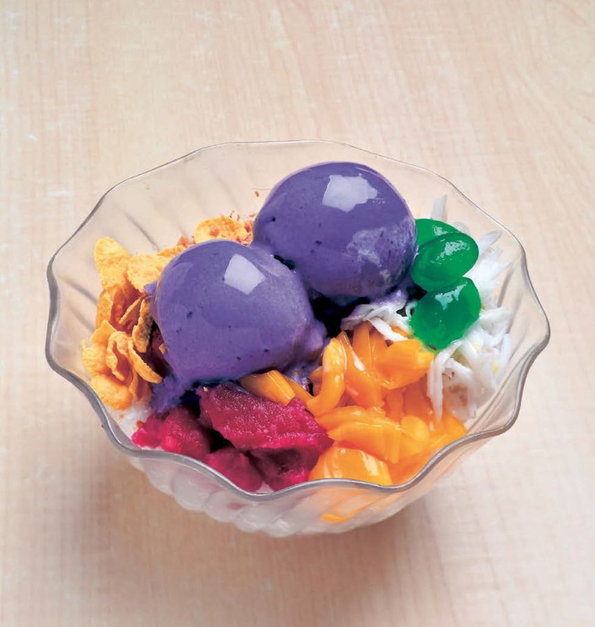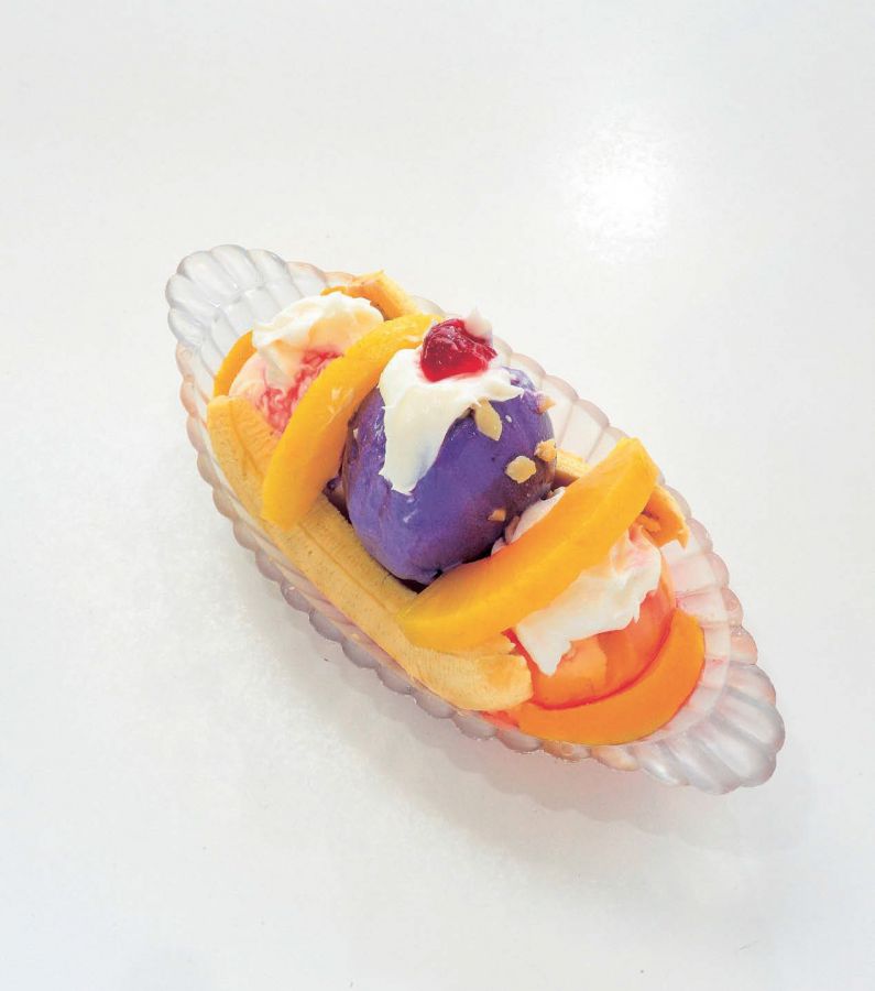 スプリット・スプリーム195P(日本円で約390円)は、バナナやパイナップル、マンゴーなどフルーツが盛りだくさん。濃厚なウベとさっぱりとしたバニラの、2種類のアイスも贅沢です♪