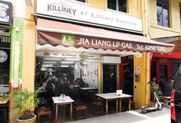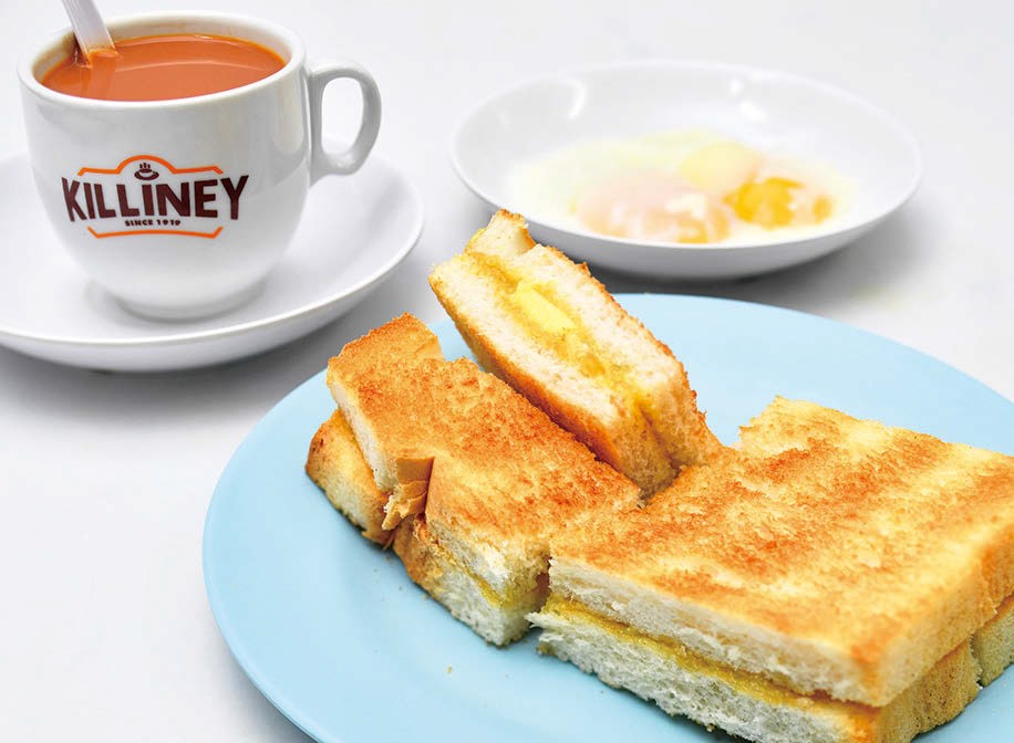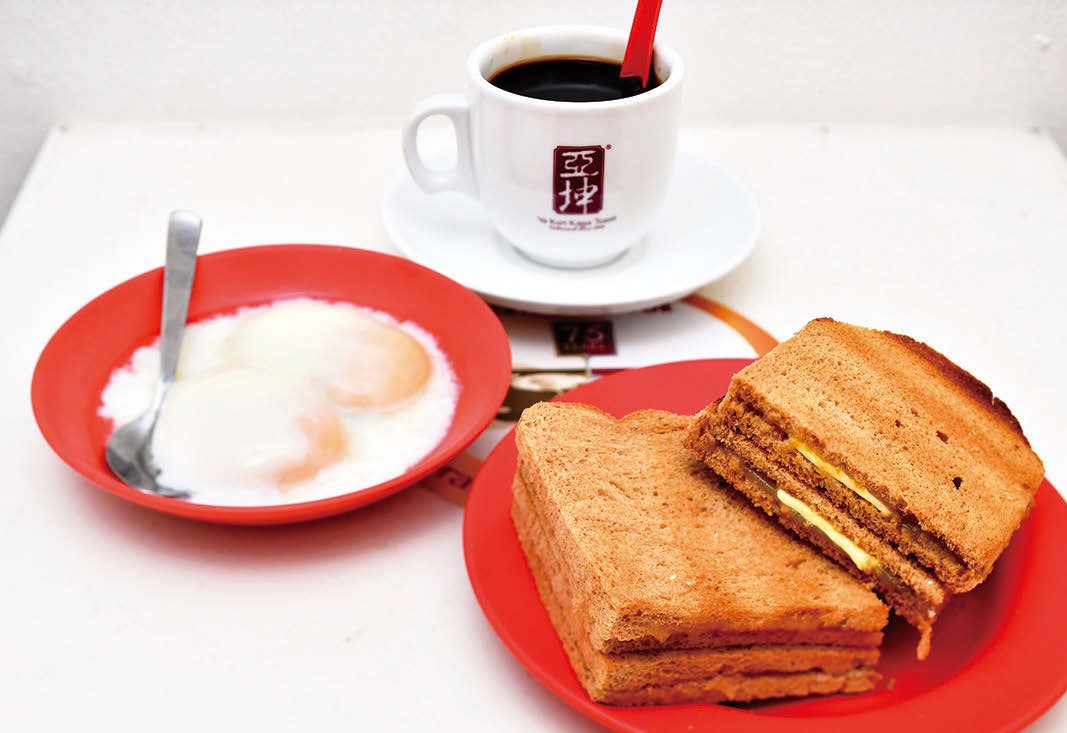 1919年創業の老舗コピティアム「キリニー・コピティアム」。昔ながらの炭火で焼き上げられるトーストや、あっさり上品な味わいの手作りのカヤ・ジャムが愛されている名店です。炭火で焼いたサクサクのパンにカヤ・ジャムとバターが付いたブレッド・トースト(1枚S$1.30。写真は2枚)は、卵(S$0.90)、コピ(S$1.60)と一緒に食べるのがおすすめです!