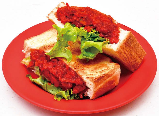 「チキン・チャーシュー・トーストウィッチ(S$4)」は、トーストしたパンに、鶏肉を使った甘めのチャーシューをサンドしたボリューム満点の一皿です。