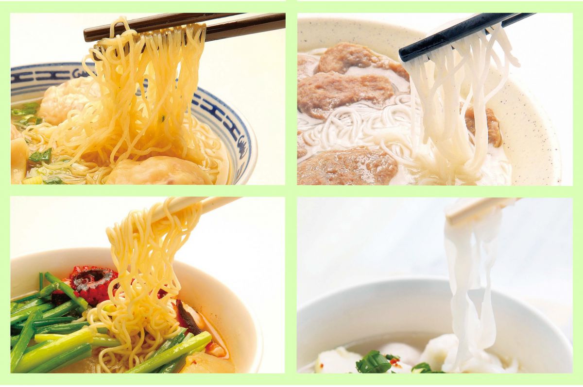 写真左上の卵細麺(面仔・幼面/Mee Kia・U-Mian)は一般的な中華ちぢれ麺で、平麺の「面薄/Mee Pok」などもあります。右上は米粉麺(米粉/Bee Hoon)で、ラクサで定番の麺です。太めの「粗(粉面)/Thick」や細い「幼(米粉)/Thin」などの種類もあります。写真左下の卵太麺(黄面/Yellow Noodle)は、丸い断面の太麺ストレートで、プラウン・ミーで定番人気です。右下のクイティアオ麺(粿条/Kway Teow)は幅広でややちぢれた感じの米粉麺。牛肉麺や炒麺などとの相性が◎です!ぜひ好みの麺を見つけてみてください。