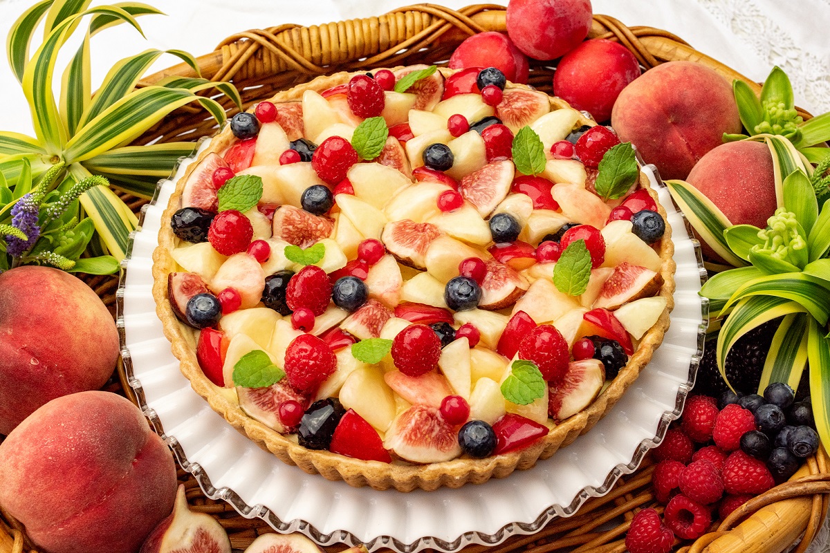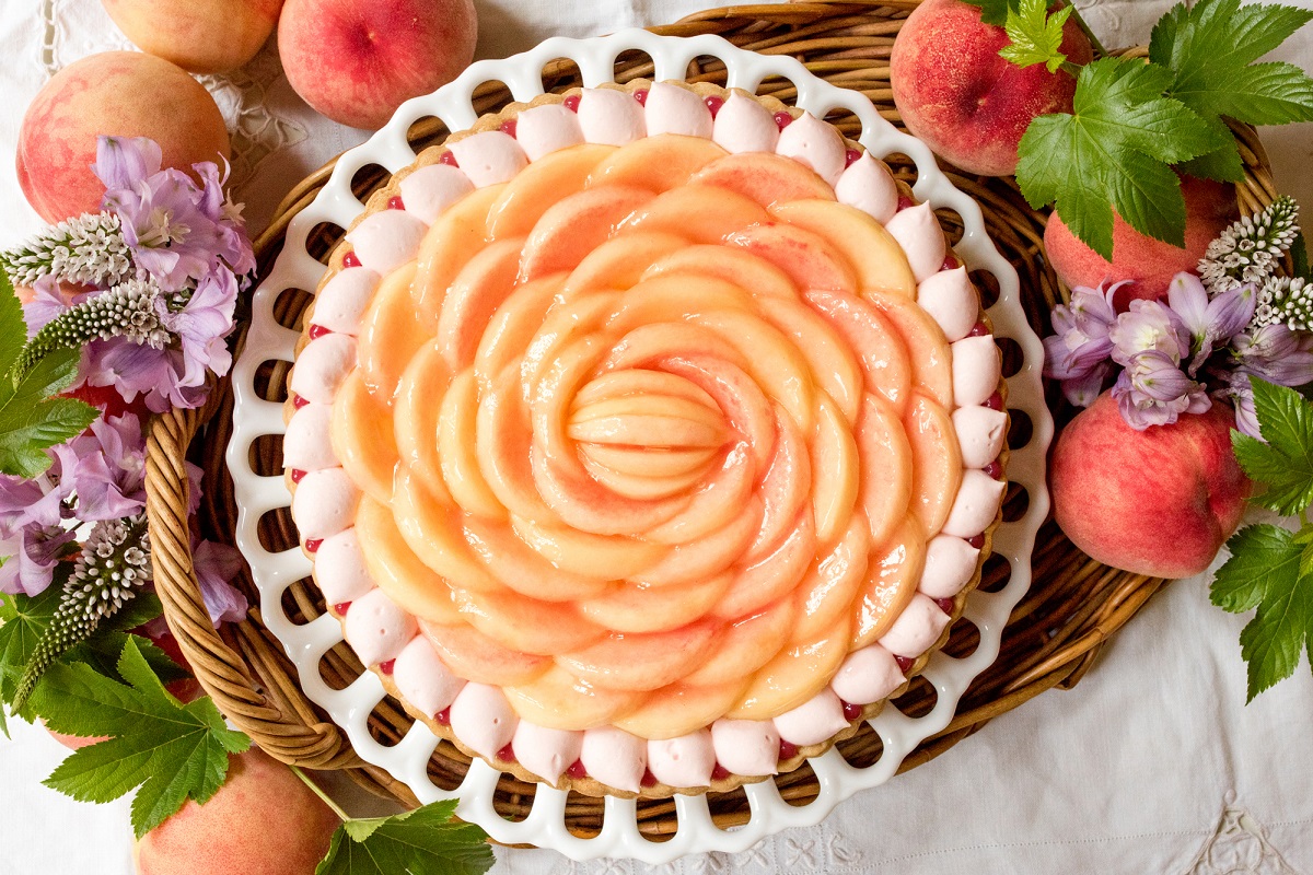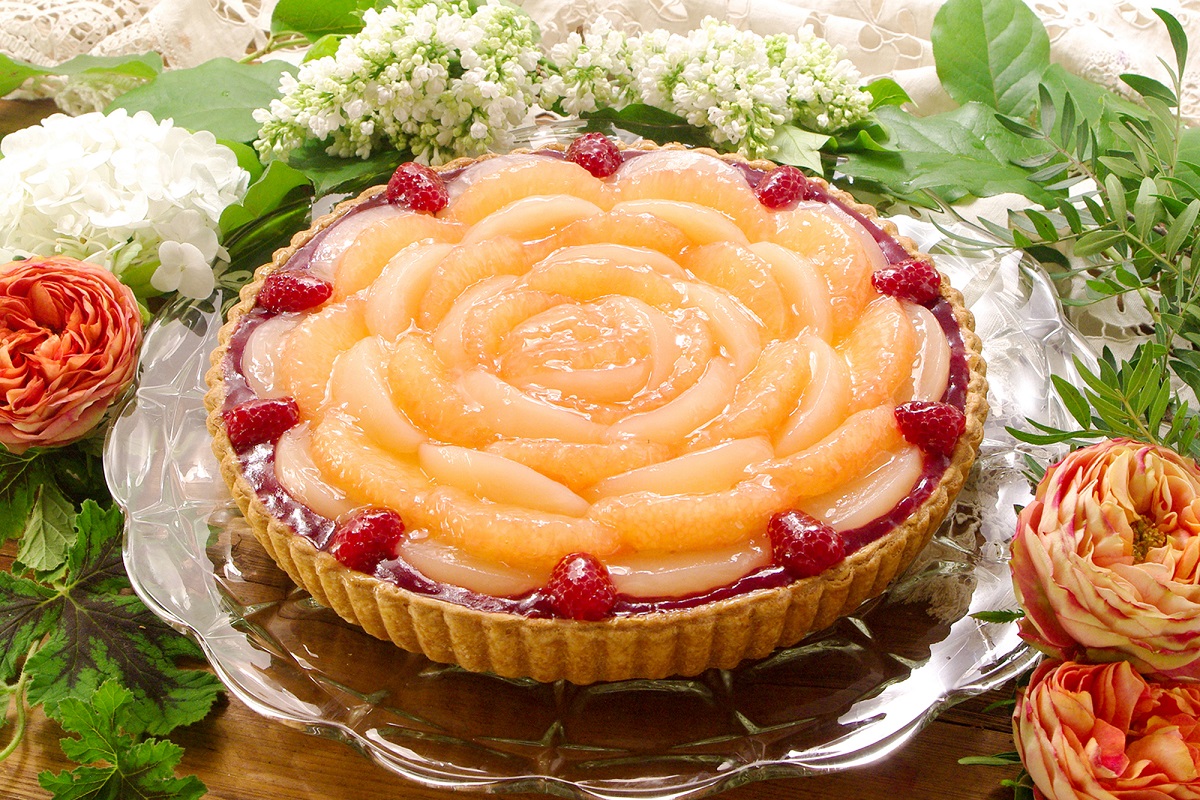 サクサクのタルトとカスタードクリームに、桃やベリーのバラ科の夏の果実がたっぷり。ふんわりとバラの香りをまとった、香り豊かで華やかなタルトです。