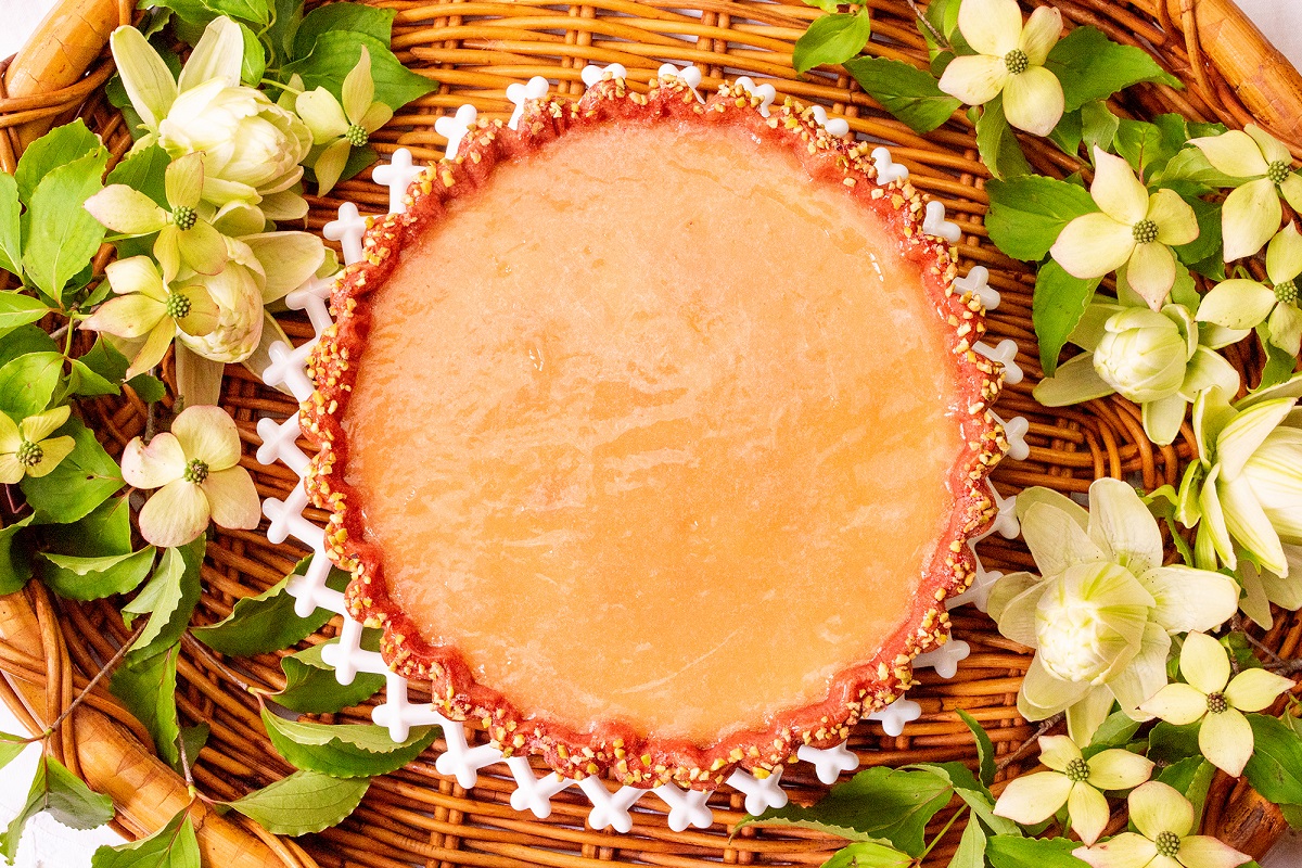 「ベイクドチーズと桃のコンポートタルト」piece756円/whole(21cm)6804円は、ひんやりと冷たく甘い桃のコンポートと“ルガール”クリームチーズを組み合わせ。
