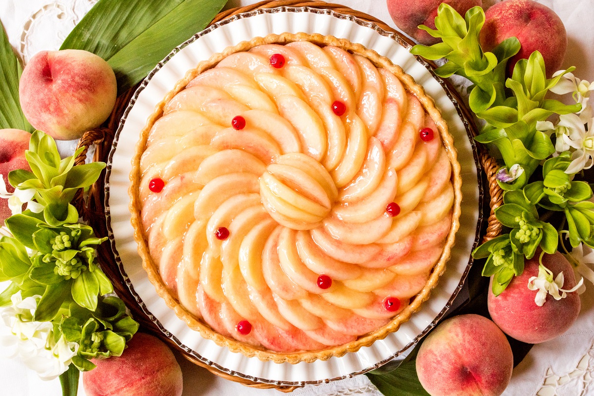 「桃のタルト」piece680円/whole(25cm)6804円は、バター風味豊かな練りパイにカスタードクリームを詰めて、甘く果汁たっぷりの旬の桃をのせています。