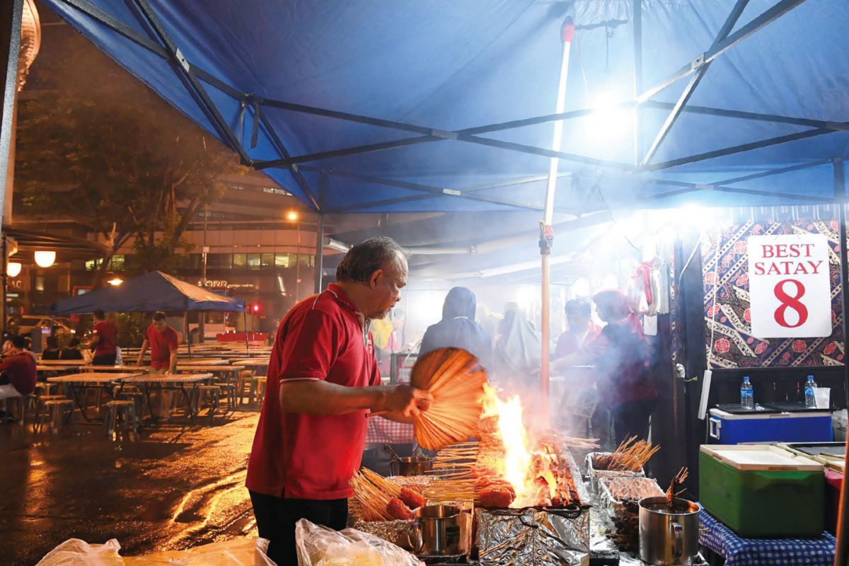 マリーナの高層ビル街にあり、ビジネスマンやOLに愛されるホーカースで、内部は明るくモダンな雰囲気です。中国系、マレー系、シーフード料理など、多彩なジャンルの料理が楽しめます!夜19時ごろになると、付近の路地にサテの屋台が並び、賑わい始めます。