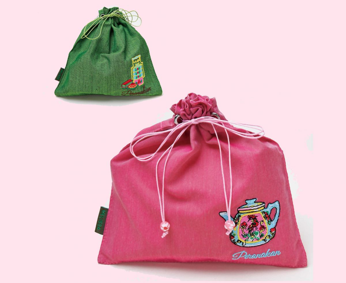 プラナカンのティーポットや伝統菓子「クエ」などの刺繍がかわいい巾着ポーチ(各S$8)は、色違いでいくつも欲しくなってしまいます。