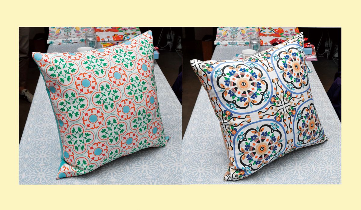 クッション・カバー(各S$55)も、シンガポールならではのデザイン。左はプラナカン・タイル、右はシンガポール植物園をモチーフにしたものだそう。