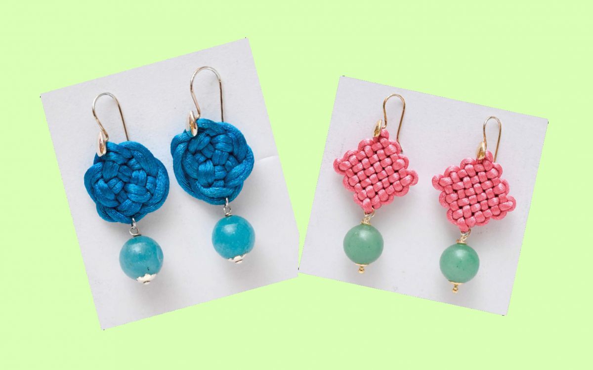 中国組み紐とストーンでできたピアス(各S$78)は、シンガポールで丁寧に手作りされたもの。とっておきの自分みやげにぴったりです。
