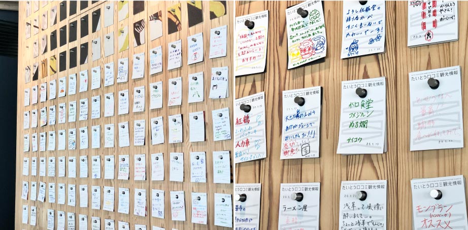 コミュニケーションボードという、実際に訪れた人が浅草のおすすめを記入しているコーナーも。