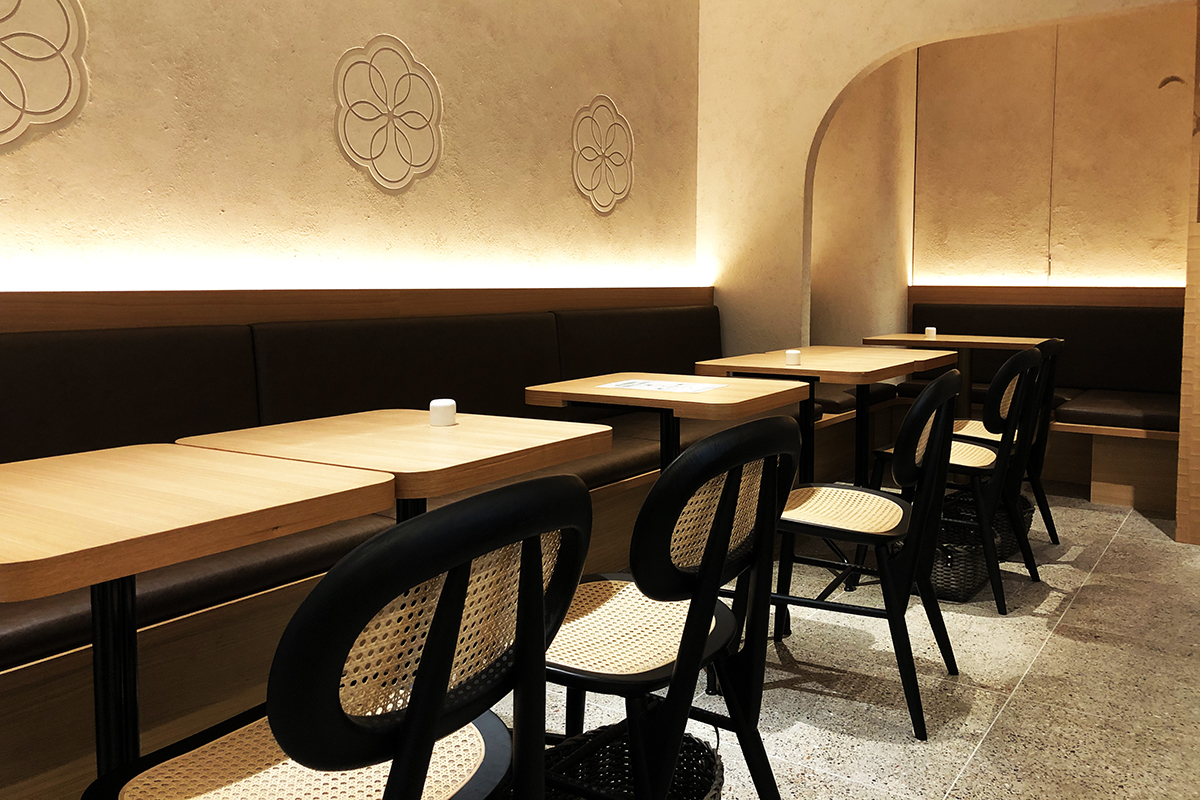 店内は日本随一の美を誇る「桂離宮(かつらりきゅう)」をモチーフにした和モダンな空間で、カウンター5席とテーブル17席を設置。買い物中のひと休みにもぴったりですね。